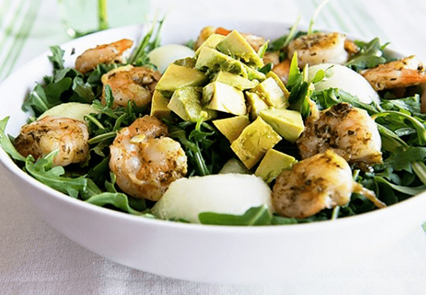 A perfectly protein packed dinner salad with pesto shrimp, fresh California Avocados, and more!