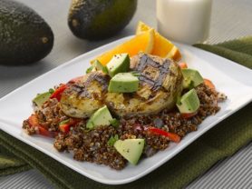 This pilaf recipe pairs avocados and bell peppers with red quinoa and grilled chicken, for a…