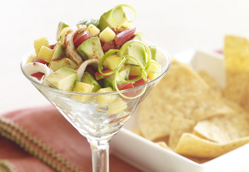 - Divide the mixture among 4 martini glasses (about 1-¼ cup of mixture per glass). Serve with tostadito shells or tortilla chips.
