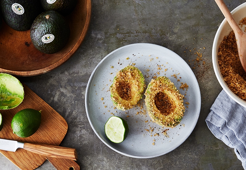 When I came up with this recipe, I was thinking about things that are encrusted, such as Scotch eggs, potato crusted fish, etc. while eating avocado. The chicharrones seemed like a good idea because of the contrast of crunch and salt.
