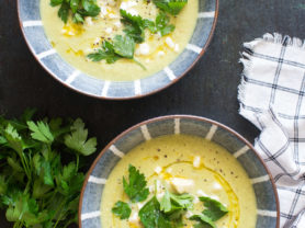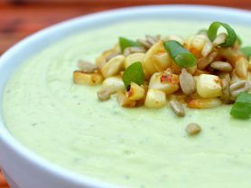 Spicy Avocado Cucumber Soup with Roasted Corn
